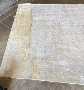 - Water leaves marks – Spills, pet accidents, or normal cleaning can cause cellulosic browning, yellowing and pile distortion.